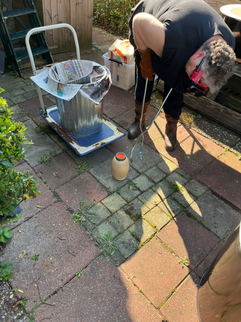 De pot wordt bij de gewenste temperatuur uit de oven getild met een daarvoor bestemde tang. Denk hierbij om beschermende kleding zoals bijvoorbeeld lashandschoenen en vuur bestendige schoenen.